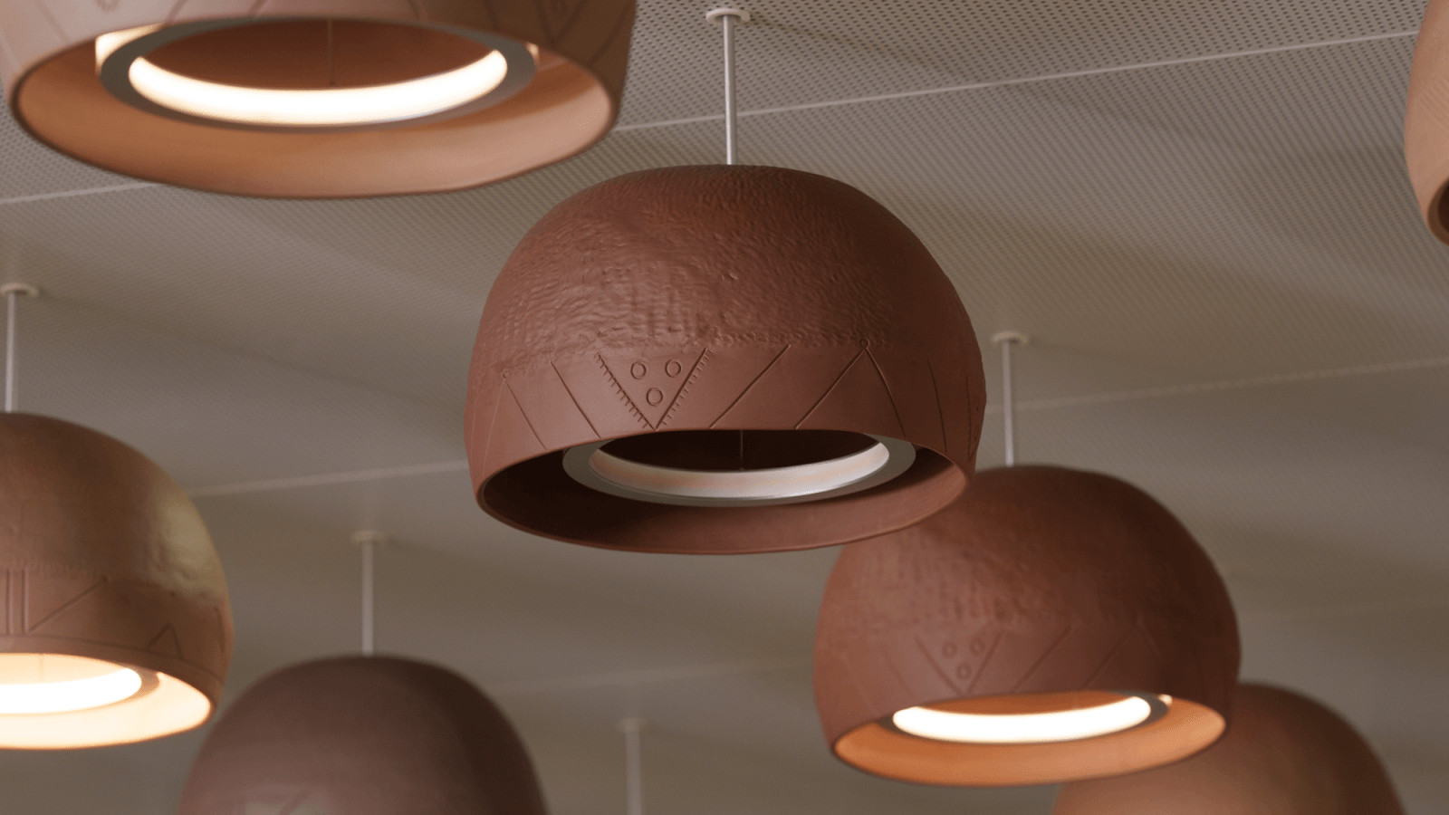 Dimmable LED rings animate a ceiling sculpture of ceramic vessels made by First Nations’ artists.