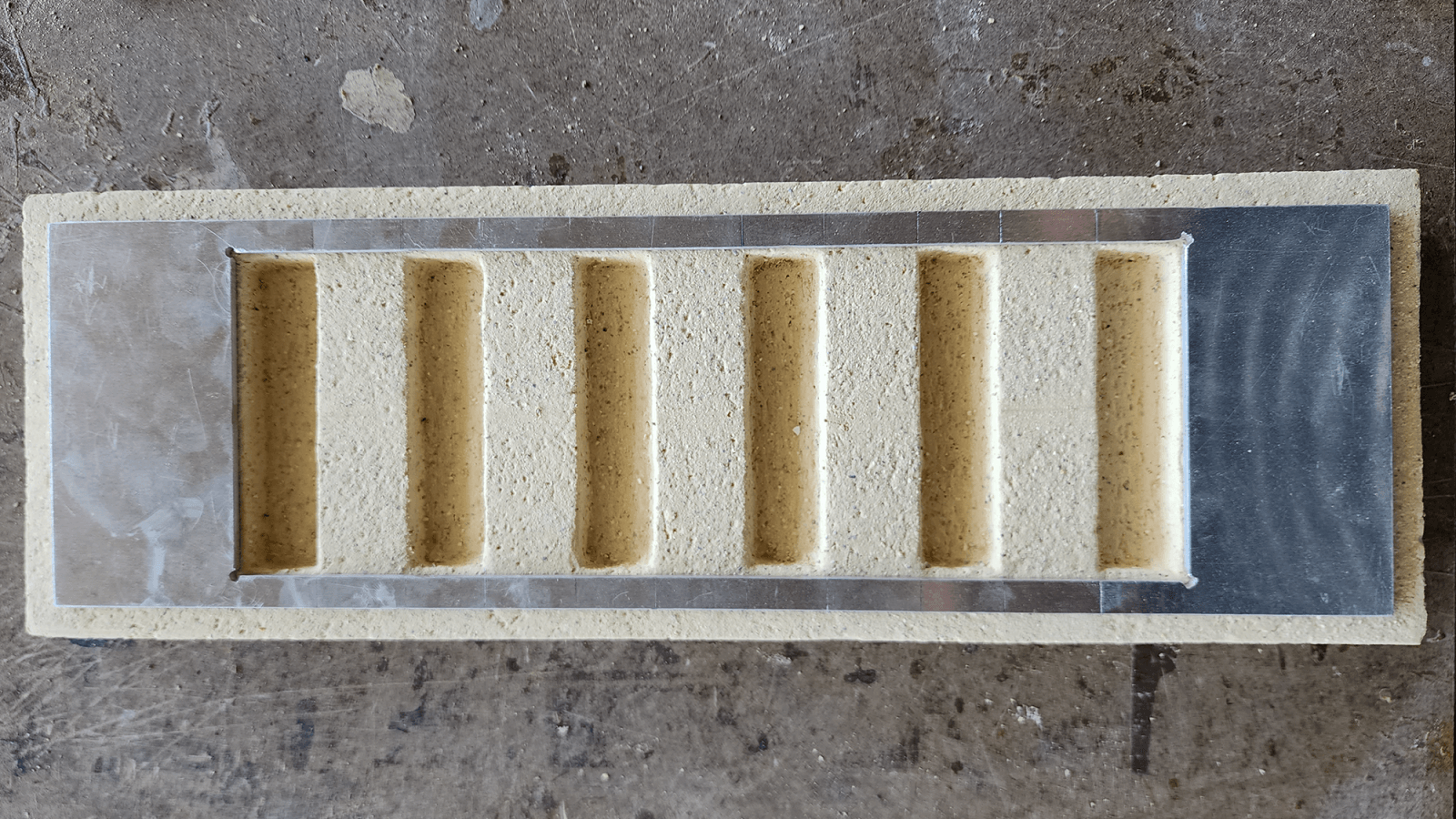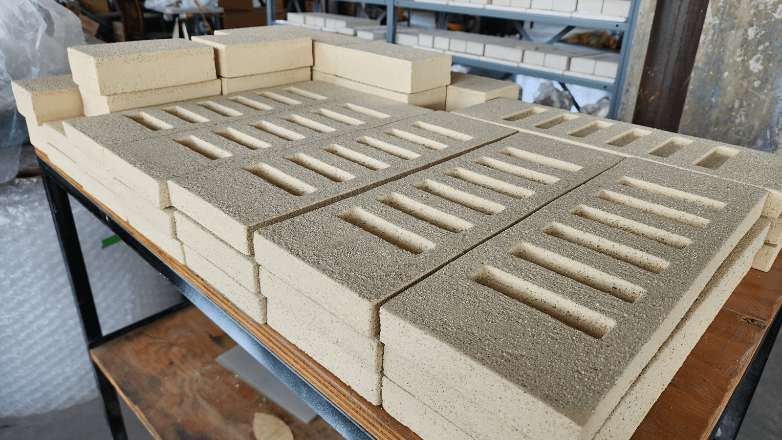 Bricks were hand crafted out of a local clay body using a slab method. Patten worked closely with Toronto ceramicist Filipa Pimentel to meet the wall’s strict dimensional criteria, accounting for two cycles of clay “shrinkage” during drying and firing. Nine different Master Bricks were formed and fired, then cut using a wet saw to create a total of 18 unique derivatives, meeting a +/-1mm tolerance. These derivatives were epoxied to plywood panels to create 24 varieties of brick modules that fit together like a puzzle. The modules are bolted or z-clipped onto a steel and plywood wall structure, and can be removed or replaced with ease, complying with the client’s request to create a brick wall without mortar. Collectively, 995 handmade bricks make up 299 brick modules in 24 distinct assemblies to form Yellow Brick Wall’s elaborate patterning.