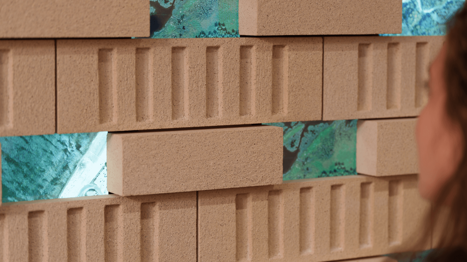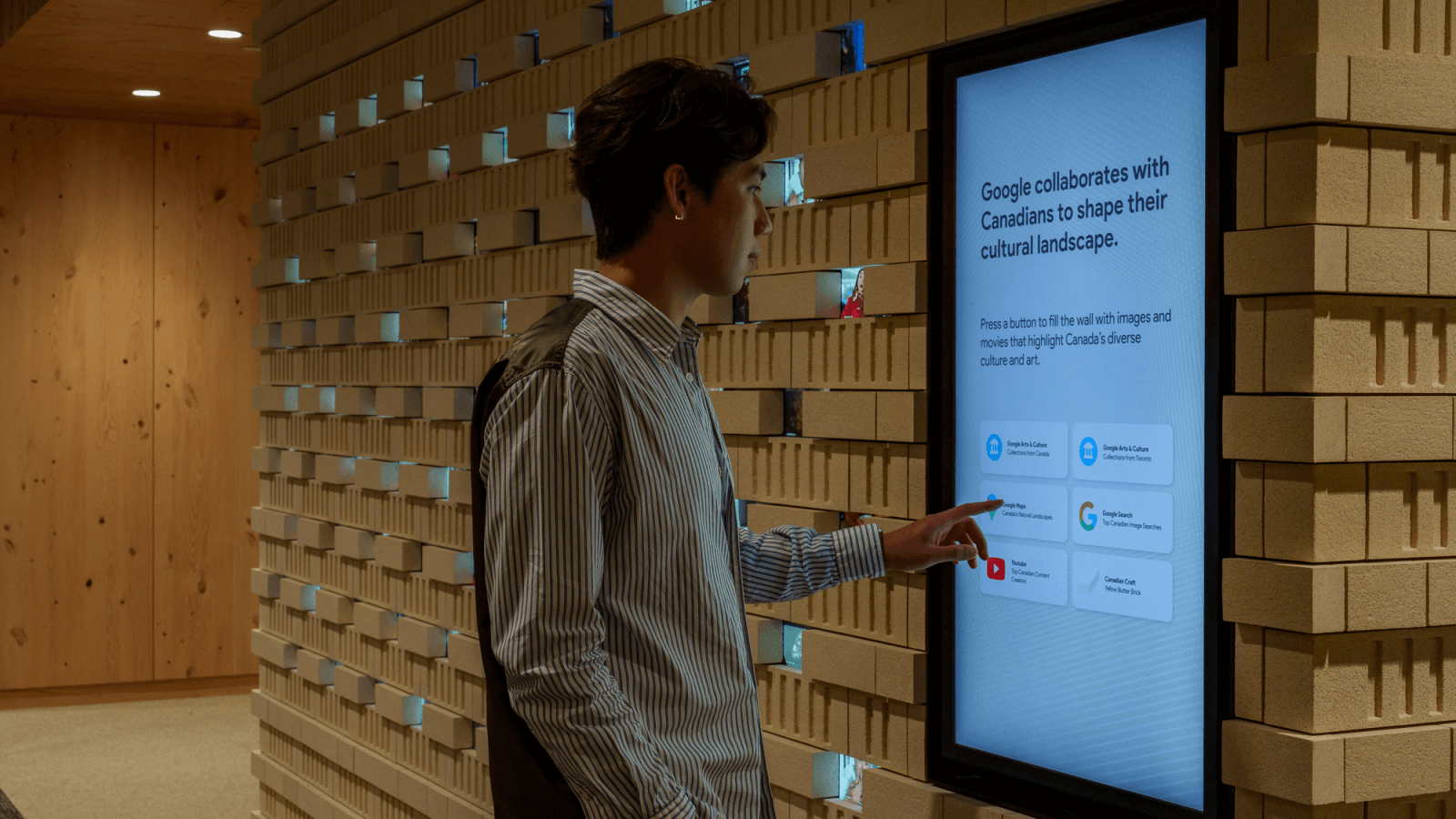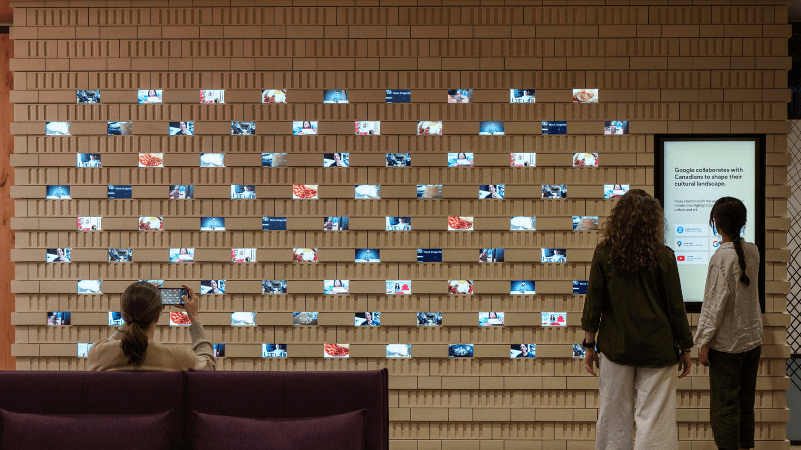 Mini displays inset in a wall composed of handcrafted bricks tell the story of Google’s impact across Canada.